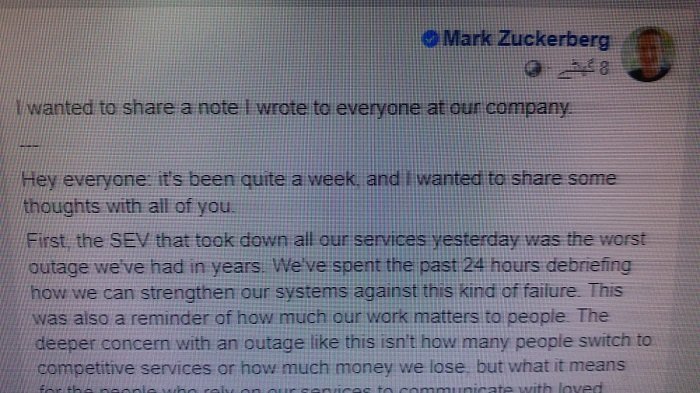 “First, the SEV that took down all our services on [Monday] was the worst outage we have had in years,” he said, adding that they spent 24 hours debriefing how the company can strengthen their systems against this kind of failure.